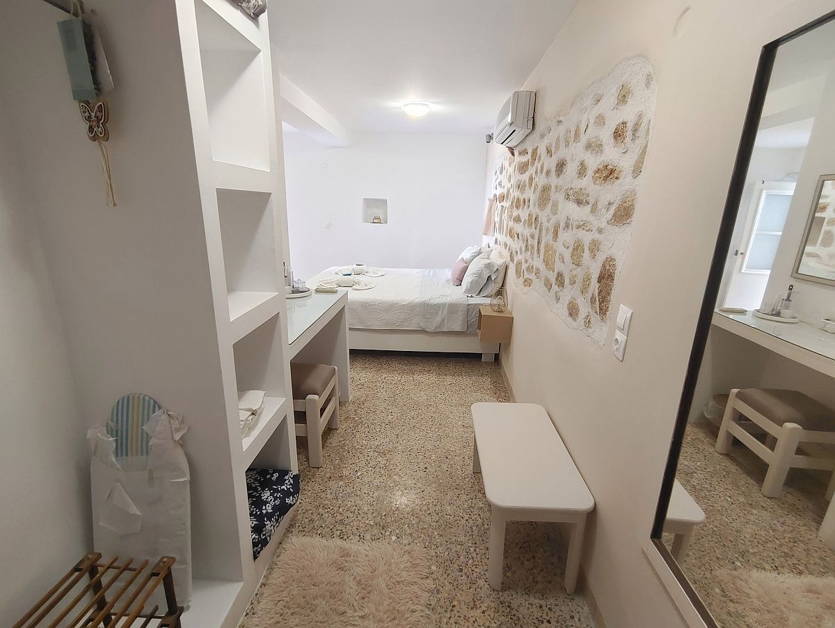 Trezor, žehlička a malé prkno na žehlení. Malá otevřená skříň s věšáky. Klimatizace, TV a bezplatná WiFi.