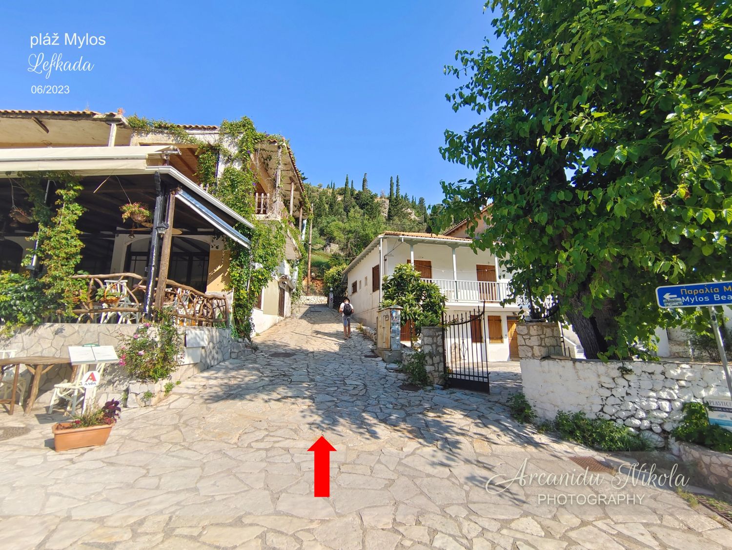 Autem - až budete mít po pravé straně tavernu Klimataria, nepřehlédněte směrovku, která nekompromisně ukazuje, že máte zahnout „ostře“ doleva – do kopce! Na první pohled to vypadá jako špatný vtip, ale to je pouhé zdání. Opravdu musíte jít po