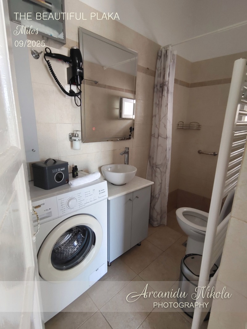 V koupelně je sprcha (pozor, vchází se do ní sestupem po 1 schodu dolů), pračka, osvětlené zrcadlo a toaleta. Ručníky, osušky a náplň na praní prádla, kterou jsme využili, a vyprali oblečení z cesty.