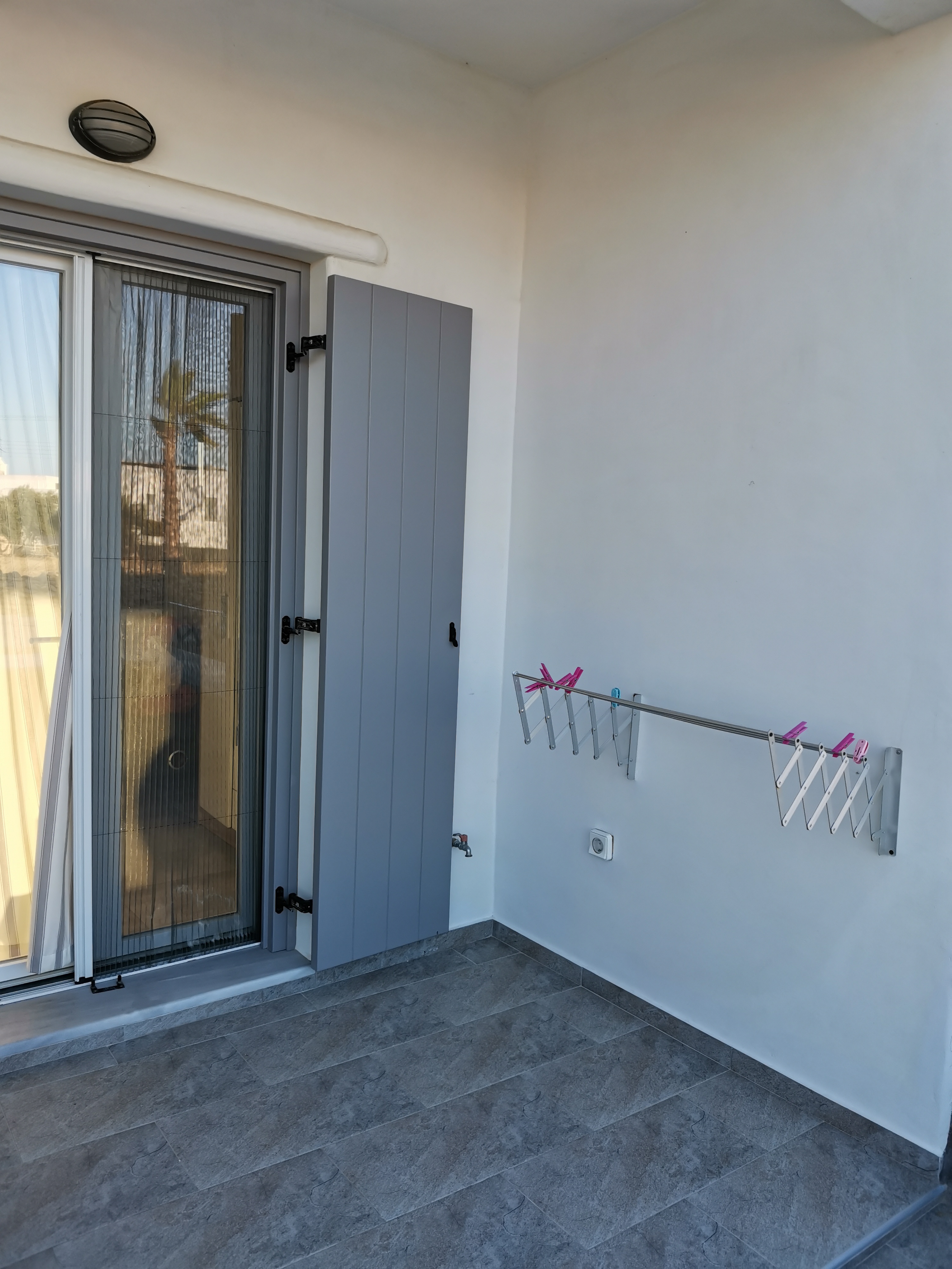 Na obou stranách je sezení - u vstupních dveří můžete snídat při východu slunce a u zadních dveří můžete večeřet při západu slunce. Vzadu je také sušák na prádlo. Ve dveřích síť proti hmyzu.