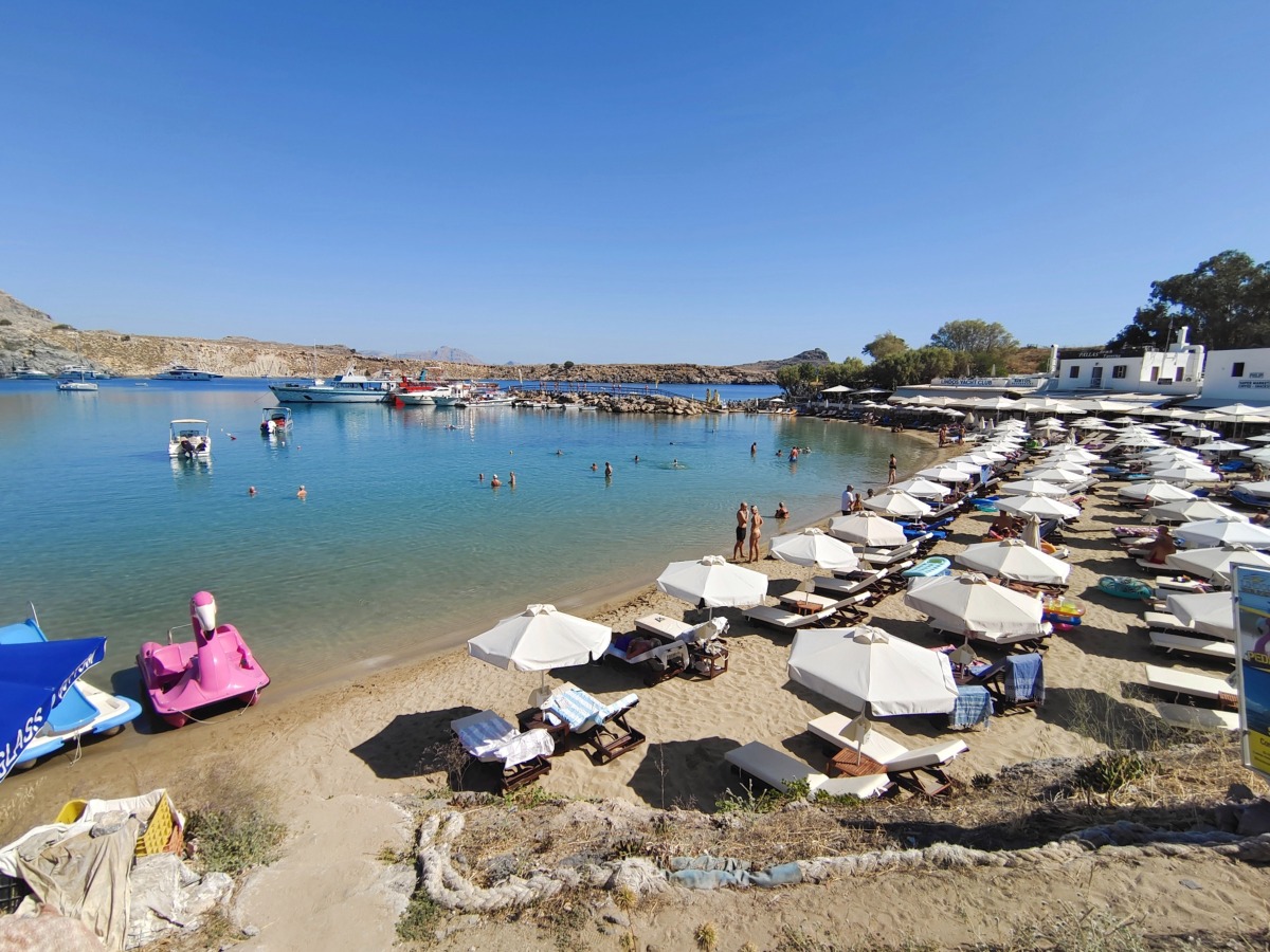 Lindos má tři pláže. Lindos Megali paralia (hlavní pláž Lindosu, největší a nejrušnější), pláž Pallas (menší, ale také přeplněná) a Zátoka svatého Pavla (Agios Pavlos, zátoka chráněná okolními útesy), ta je vzdálenější od prvních dvou).