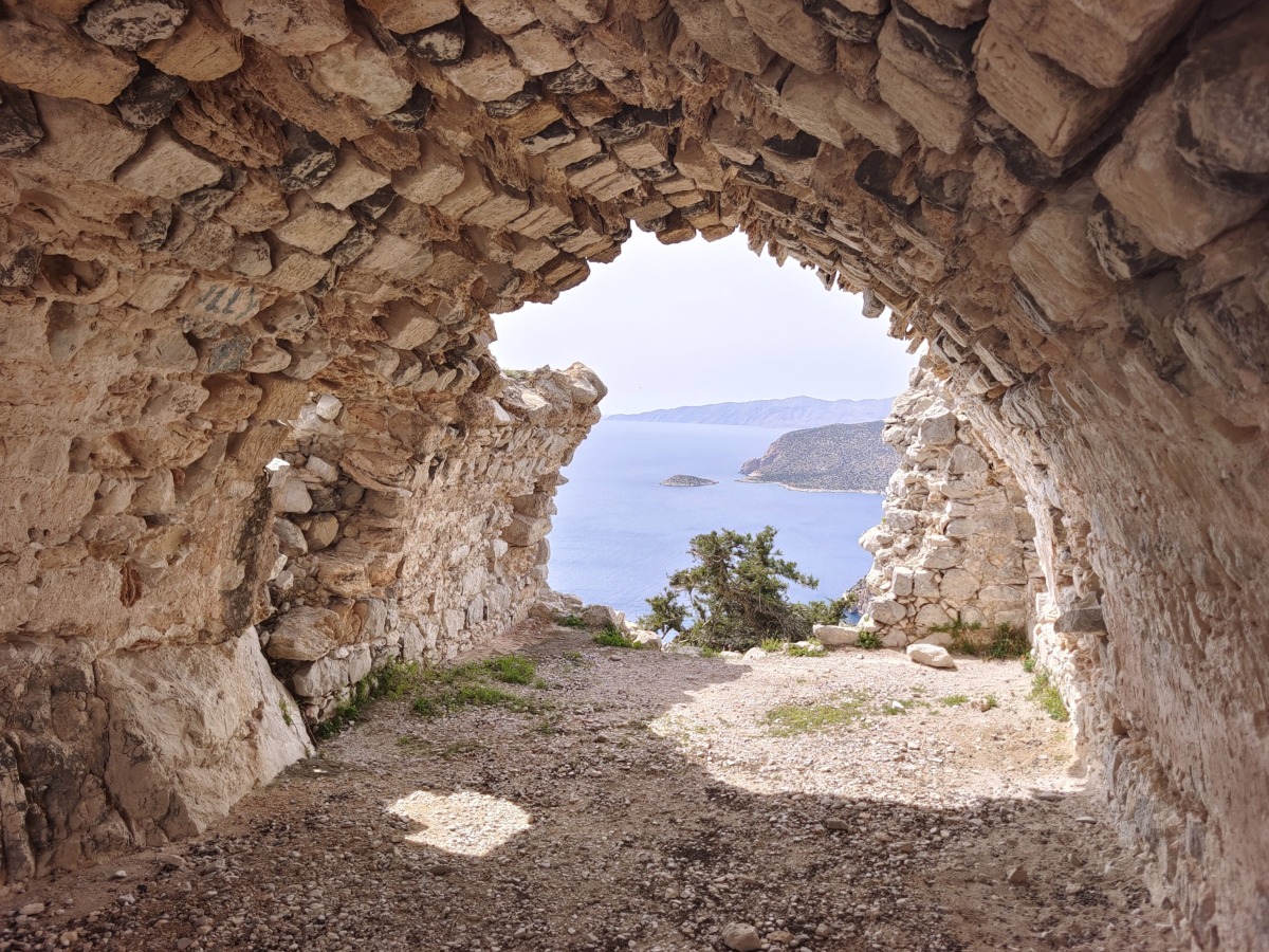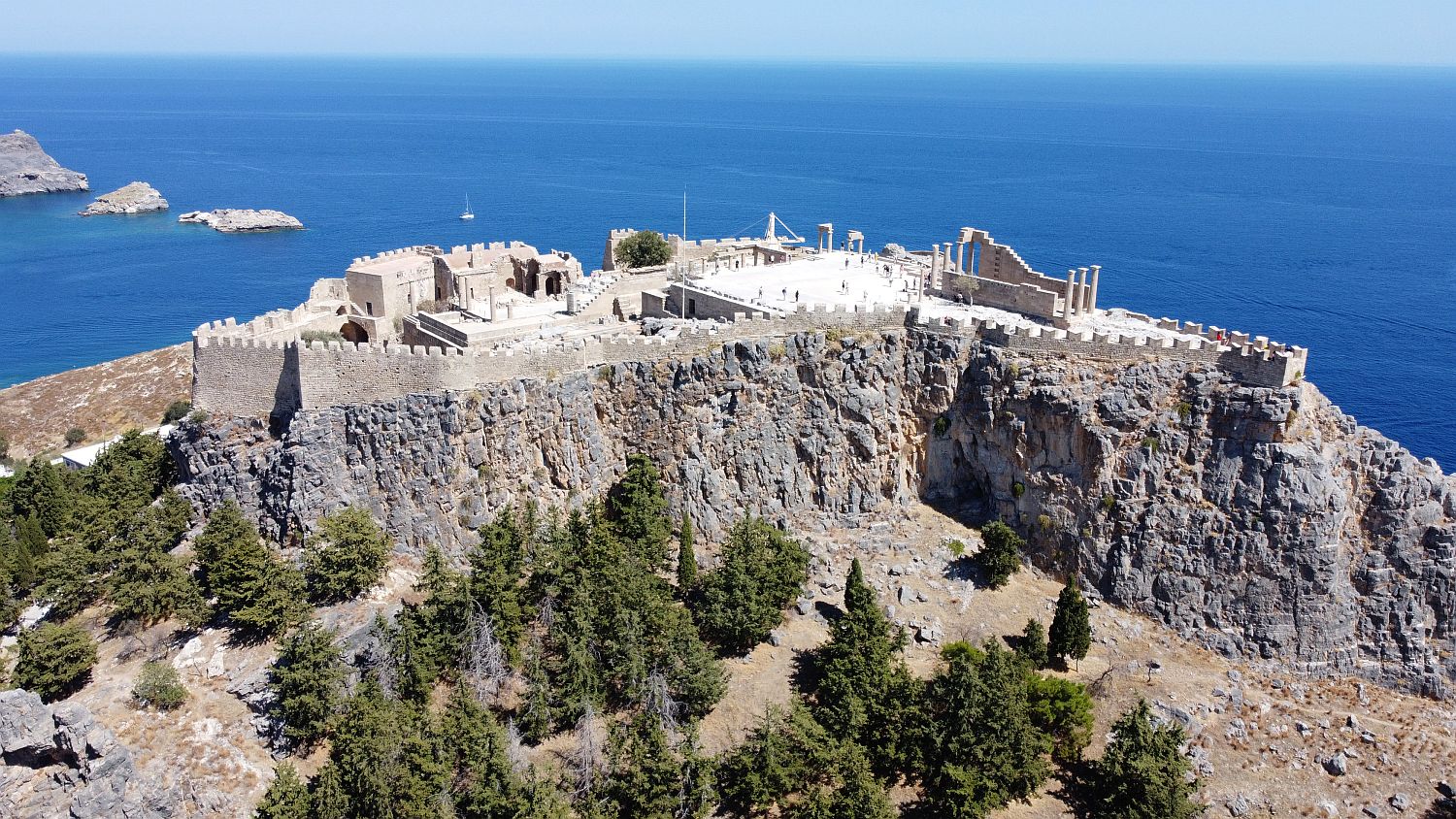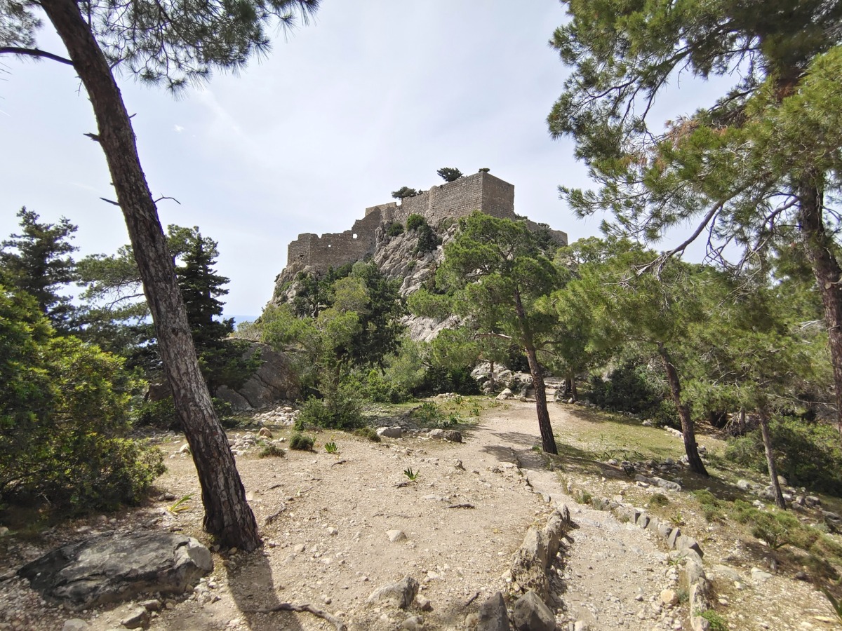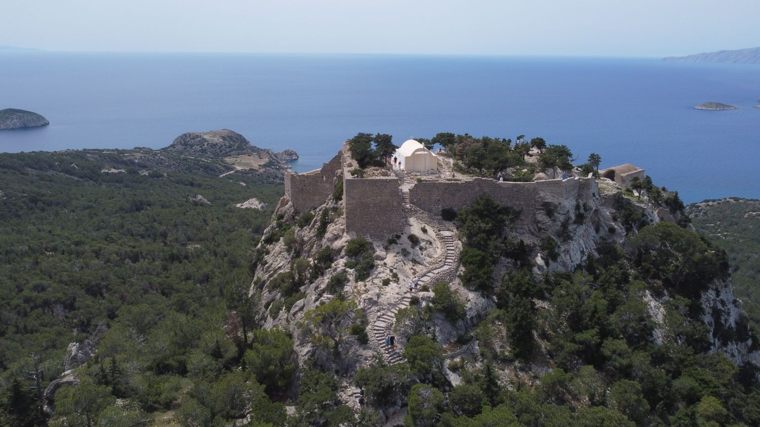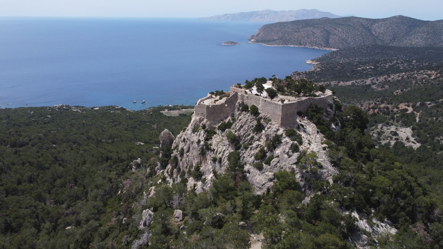 Hrad Monolithos se nachází ve výšce 236 metrů a je umístěný na jediném skalním výběžku – proto název Monolithos – s výhledem na ostrov Chalki.