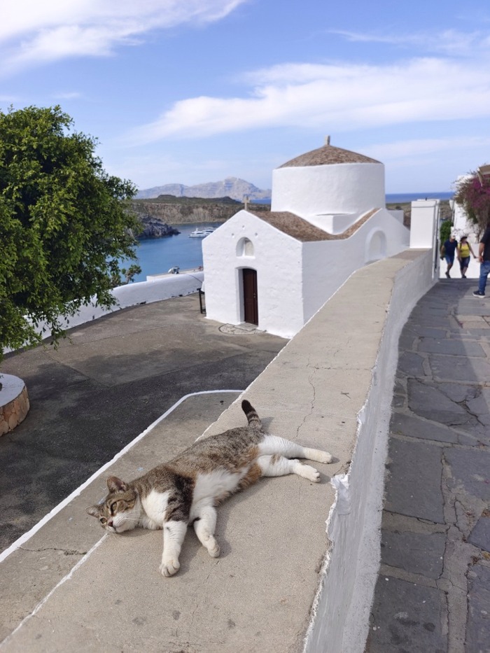Všude je mnoho koček. Například "míšená turecká angora" - Rhodos je blízko Turecka a já si myslím, že první kočka, co se sem dostala, byla hladová cestovatelka, která se nebála vejít na rybářskou loď, kde cítila ryby.