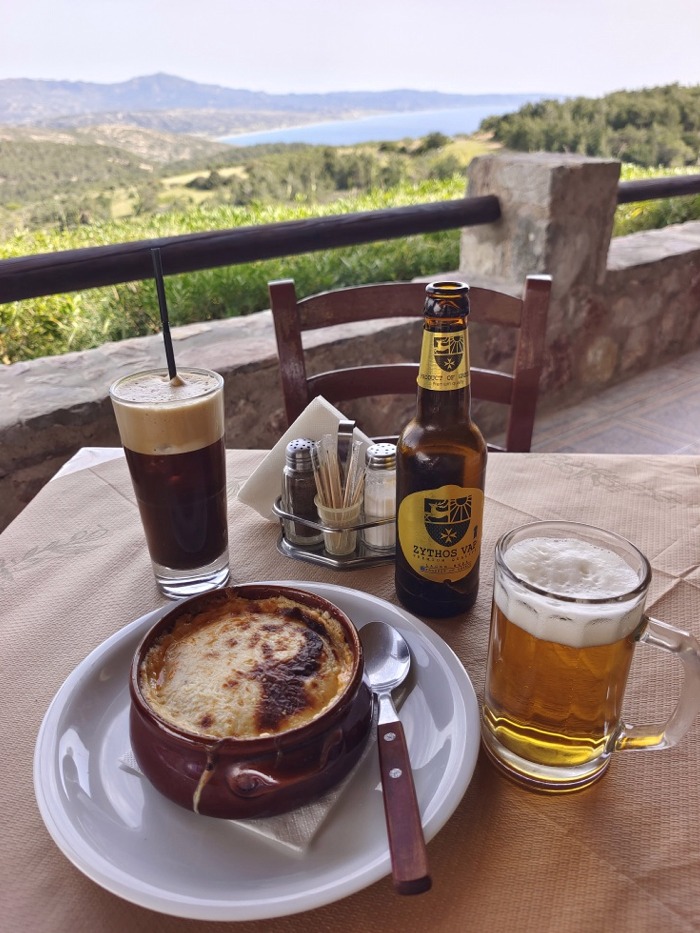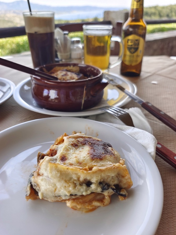 Cestou z hradu jsme se zastavili v taverně Panorama, protože jsme chtěli Mousakas a frappe, obojí naštěstí měli.... Taverna má milého číšníka, skvělé řecké jídlo a překrásný panoramatický výhled, doporučuji.