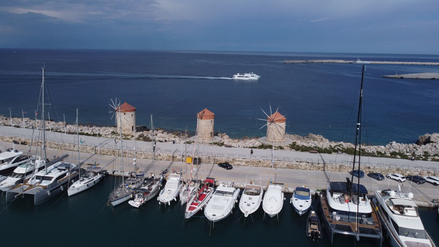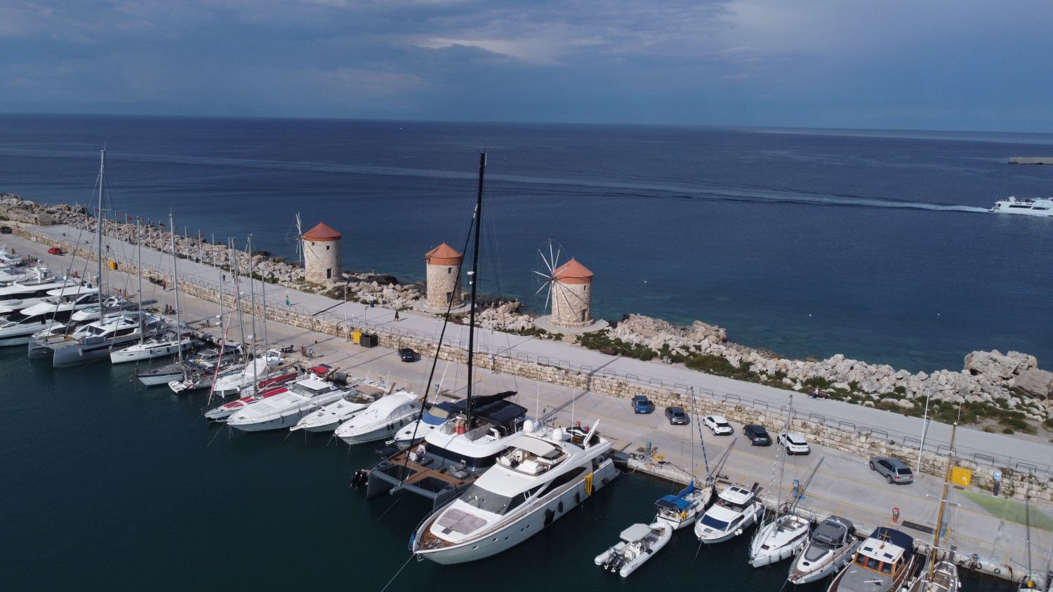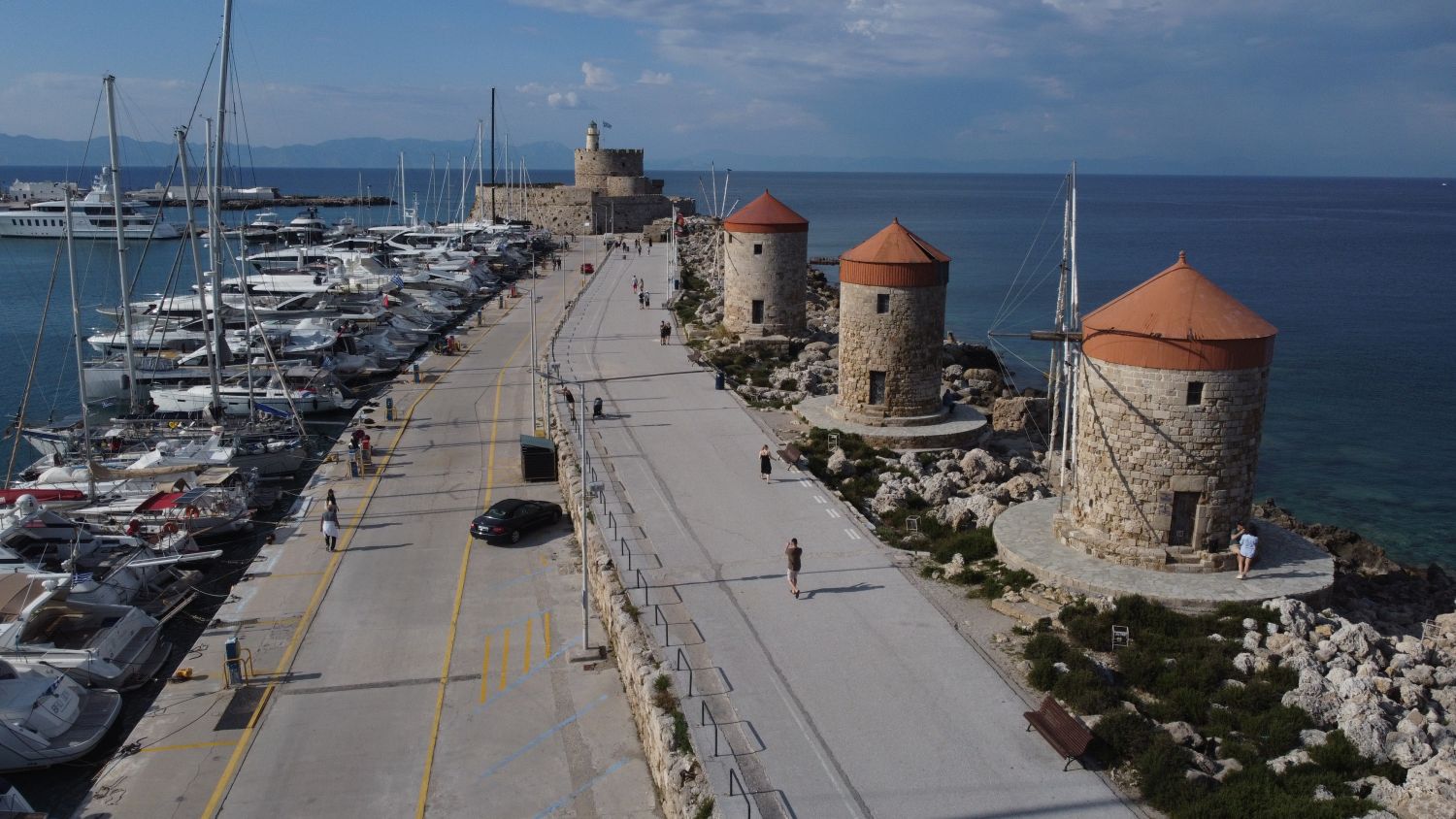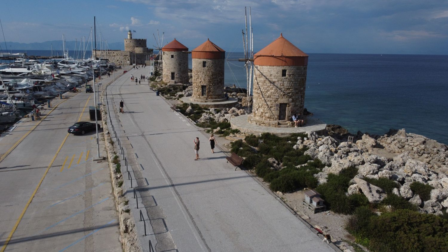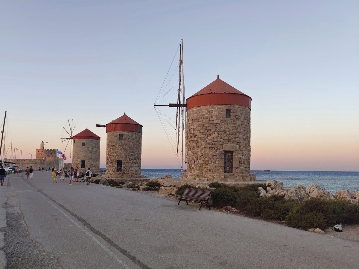 Nejznámější 3 větrné mlýny na celém ostrově Rhodos se nacházejí na východním molu přístavu Mandraki. Tyto středověké větrné mlýny se používaly k mletí obilí, které pocházelo z komerčních lodí kotvících v přístavu.