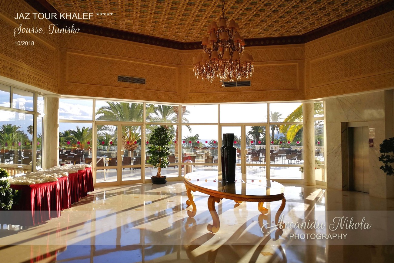 Na hotel jsme přijeli asi ve dvě hodiny ráno. Z letiště Enfidha trvala cesta hodinu, v autobuse nás bylo pouhých 13 osob. Po vyplnění ubytovacího formuláře jsme dostali vkusné stříbrné pásky na ruku. Jednu kartu od pokoje a dvě karty